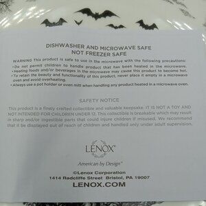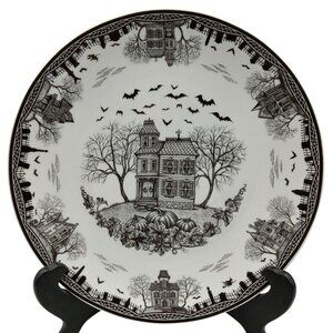 Enter a spooky world with this Lenox American By Design Haunted Village dessert plate set. Each plate features a haunted house, bats, and eerie trees, perfect for Halloween gatherings. Crafted from fine porcelain, these plates are both microwave and dishwasher safe, making them as practical as they are enchanting. Comes in original box with COA and other documents. Plate stand is not included.