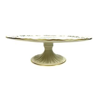 Exceptional and gorgeous vintage Lenox Holiday Dimension Gold Rim pedestal cake stand is perfect for displaying and serving your holiday treats! This plate measures 3.5" H x 10.5" in diameter and is in excellent pristine condition. Make this part of your holiday serve ware today! # 3952
