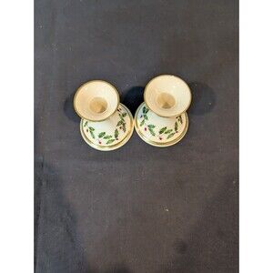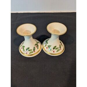 Lenox Holiday Holly & Berry Candle Holders Pair Porcelain w/ Gold Trim 4"