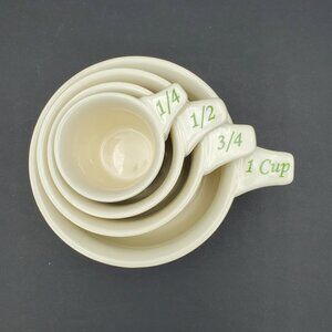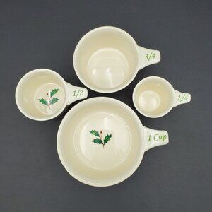 Lenox Holiday Measuring Cups. 1 cup, 3/4 cup, 1/2 cup and 1/4 cup pieces. Very good pre-owned condition but the 3/4 cup has a small nick on the top rim - please see the last photo.