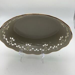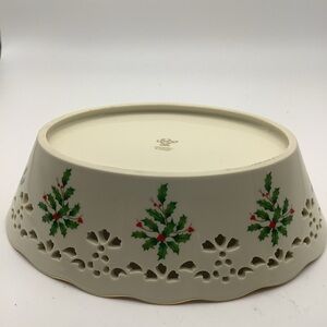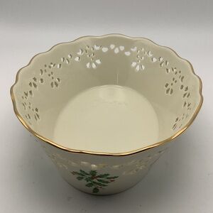 Beautiful Lenox Holiday pierced oval bowl featuring pierced ivory china, holly design, and gold trim. Pre-owned, good condition.