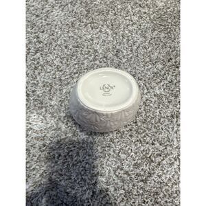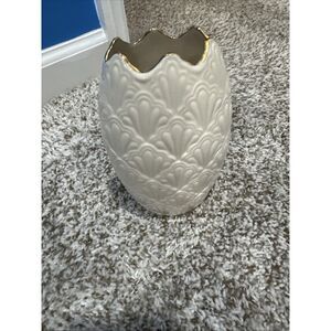 This Lenox vase is a large 10" porcelain piece made in the USA, featuring a traditional jacquard pattern in ivory with a scalloped and embossed design. The vase is crafted from bone china and adorned with a 24k gold trim, adding a touch of luxury to any space. With its intricate raised design and elegant style, this vase is a stunning addition to any collection or home decor. Its measurements are 5.75" in length, 8.5" in height, and 4" in width, weighing 2 lbs. It is recommended to clean this vase with warm water for maintenance.