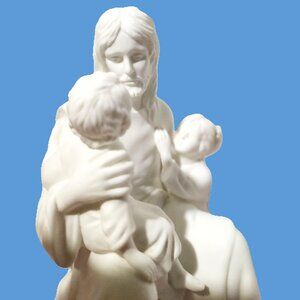 Figure of Jesus with Boy Sitting on His Knee. Girl is Standing to the Side and Looking Up at Jesus. Very Detailed from the Strands of Hair, Facial Features, Folds in Clothing, Fingertips to Jesus's Feet.
