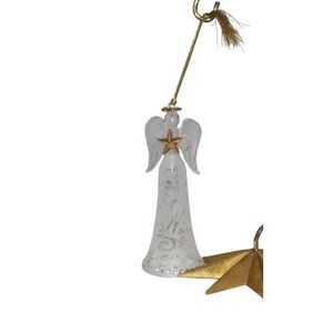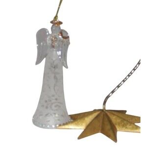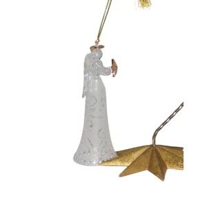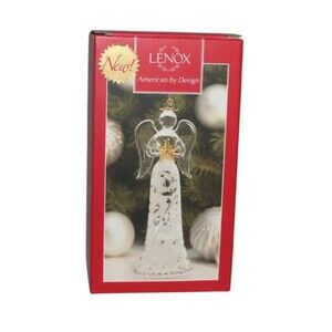 Lenox Joyous Tidings Noel Angel Glass Holiday Ornament. This angel-shaped ornament features a white, clear, and gold color scheme. Made of glass, this contemporary style ornament stands at 6 inches tall. Item is in great condition with no chips, cracks or repairs made, see photos.