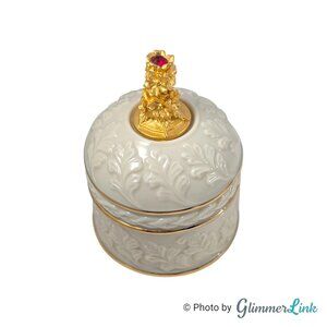 Vintage Lenox China Treasures Collection trinket box for July, featuring a ruby red crystal accent on a gold-tone floral finial. The porcelain body is embossed with a leaf motif and finished with fine gold colored trim. A lovely collectible or gift for a July birthday.