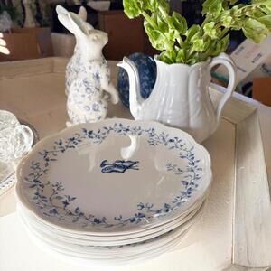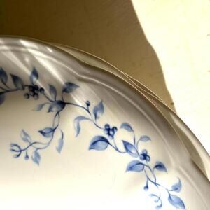Beautiful clean white and classic blue. Trumpet and berry design in center. Scalloped edge that rounds up some.