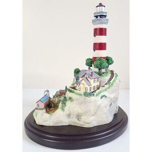 Detailed porcelain lighthouse sculpture capturing a scenic coastal landscape with intricate architectural and natural elements. Minor packaging wear, minor flaws on trees but not visible unless zoomed in.
