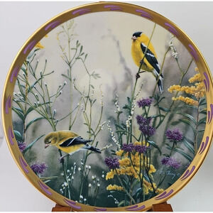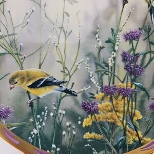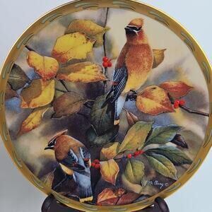 The Lenox Nature Plate Collection Among The Berries and Gold Splendor Wall Hanging Set 2 features a round porcelain collector plate with a beautiful multicolor design depicting birds. This decorative piece is vintage from the late 20th century and showcases American culture through its nature-themed motif. Made in the United States and produced in fine china, this unique wall hanging set is perfect for all occasions and adds a touch of elegance to any space with its intricate bird pattern and gold splendor accents.