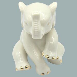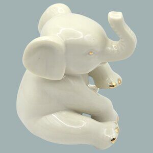 Lenox porcelain sitting baby elephant figurine. The elephant has its' trunk up and has gold accents at the toes and eyes. Bottom is marked LENOX.