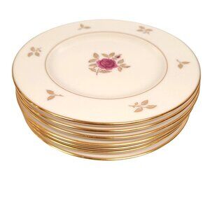 Vintage Set 7 Lenox Rhodora fine China bread salad dessert plates, P471. Rose Pattern with gold leaves and trim. 6 1/2'' in diameter with gold stamp on the back. No chips, crazing or cracks.