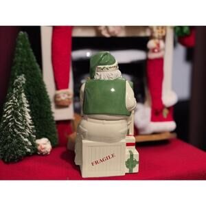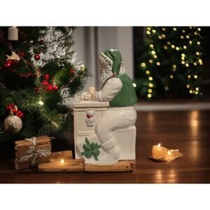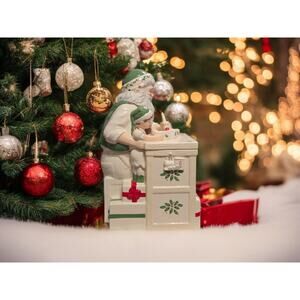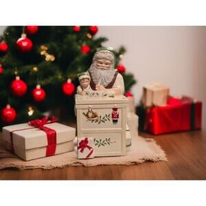 This elegant piece is from Lenox and it's called Santa's Workbench Toy Shop. It's a cookie jar that is white with 24K gold accents. Santa and the elf are wearing matching green hats and plaid vest. Santa is showing the elf how to paint things. It measures approximately 13" tall x 7.25" long x 8" wide. It's NIB. EXCELLENT CONDITION. Please look carefully at all of the pictures and let me know if you have any questions.