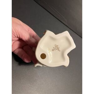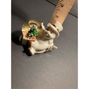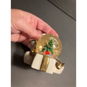 This adorable little snowman holds a little snow globe with a little Christmas Tree. The fluid in the globe is not 100% clear. It’s a soft golden hue, but not at all cloudy. This is great for small spaces where you just want a little holiday cheer. No damage.