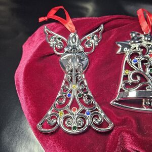 The set includes a snowflake, angel, bell, tree, heart, snowman and reindeer ornaments, all with a scroll of multicolor rhinestone on silver plated metal. The ornaments come in new condition in their original packaging.