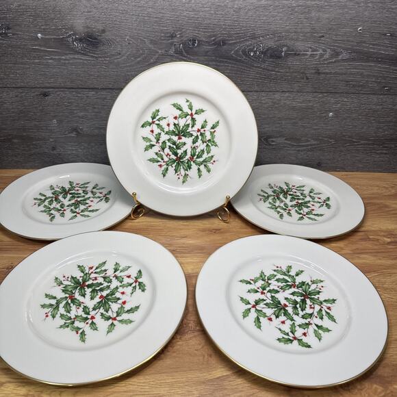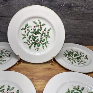 Lenox Special Christmas Dinner Plates Large Holly Berry Gold Trim 10.5" Set of 5