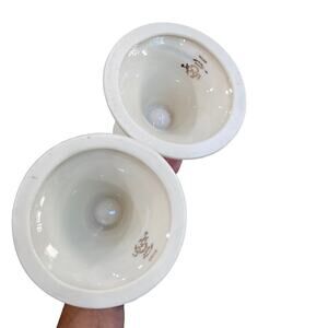 Ivory Porcelain with Hand Decorated 24K Gold around the upper edges and bottom rims. Holly Berry pattern is around the base. H 3.75in × base Diameter 3.7 Sin. Will hold a one inch tapered candle. Vintage from the 1990s. Made in the USA.