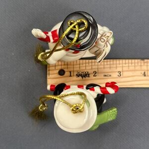From Lenox’s “Very Merry” series, this charming set includes a snowman on skis holding a gift and a penguin holding a candy cane. Both feature fine hand-painted porcelain detail, glossy finish, gold tassel hangers, and festive holiday colors.