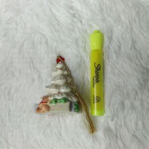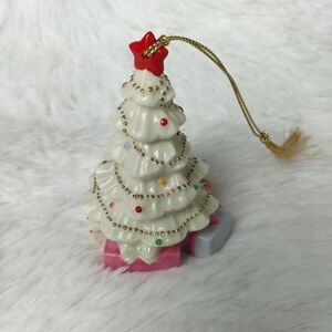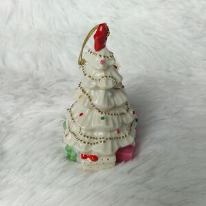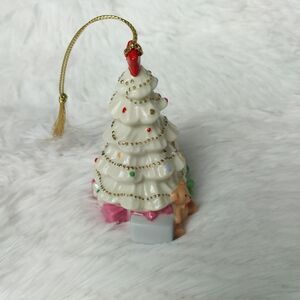 Elegant Lenox ornament featuring a white Christmas tree with gold accents and red star topper. Adorned with colorful details and a cute teddy bear & presents.