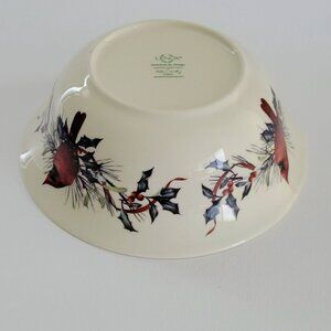 Elegant ceramic bowl with a festive cardinal and holly design. Ideal for serving during the holiday season. Microwave and dishwasher safe.
