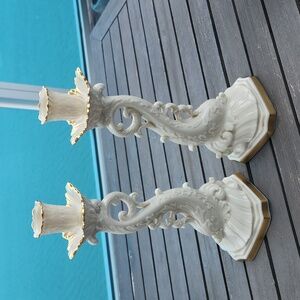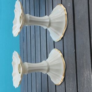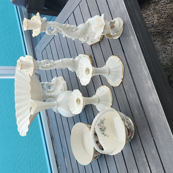 Lenox bundle, 2 sets of candle holders, 1 single candle holder, 1 bowl woth handle, 1 bowl, 1 vase. 1 candy bowl