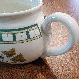 Measures 8" long including handle, 3" across, and 4" tall at maximum height. Casual Images Collection. Has green and gold lines on border, a rose bud and blue flowers with ivy leave details. The gravy boat is made in Brazil and decorated in the U.S.A. This is a discontinued pattern and was made between 1996 - 2003.