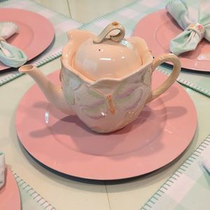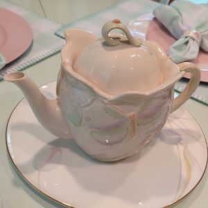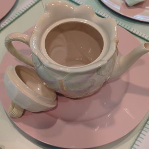 Garden Splendor Lenox Teapot. Soft pastels. Gorgeous piece.note..peachy server plate and platter not included. Used for display in home staging only. Just noticed a chip on the handle of the top..see last picture, not noticeable but for disclosure purposes.