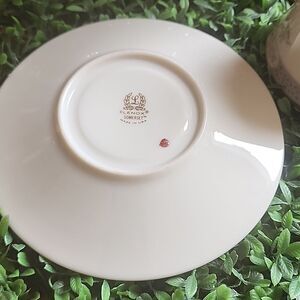 Dainty pink florals with gray band, gold tone rim.