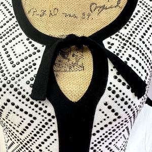 Elevate your wardrobe with this designer Leo Guy sweater, featuring a chic geometric pattern in classic black and white. The tie neck and casual sleeves add a touch of sophistication, perfect for any occasion from business to travel, party, or casual wear.