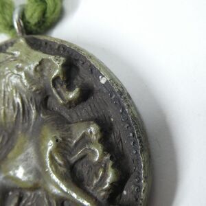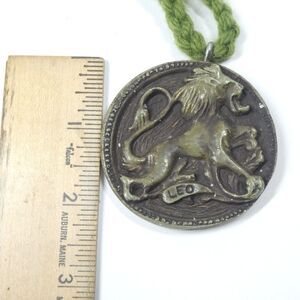 Vintage pendant featuring Leo the Lion. Appears to be handmade of clay and painted green. Has a metal loop at the top for hanging, and has been strung onto yarn as a necklace. Nice large size, about 2.25 inches in diameter. A couple of small chips in the paint, but still displays well.