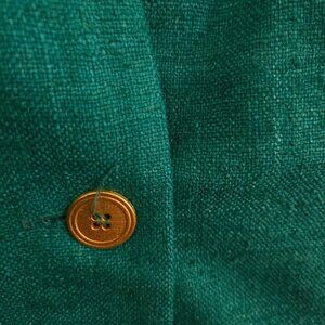 Elegant vintage teal blazer crafted from 100% silk, featuring a single-breasted, collarless design. Fully lined with a one-button closure and shoulder pads for a classic silhouette. Made in the USA.