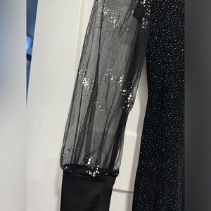 This image showcases a stunning black dress designed with a blend of elegance and sophistication. The dress features a fitted silhouette that accentuates the body, with glittery fabric adding a glamorous shimmer throughout.