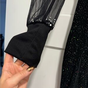 The sleeves are made of sheer black tulle with delicate sparkly embellishments, giving a semi-transparent, ethereal appearance. They are long and cinched at the wrists with solid black cuffs for a polished look. The back of the dress includes a zipper closure for a sleek and seamless finish.