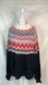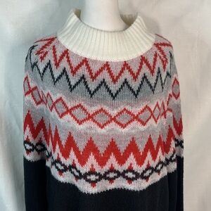 Fun and snuggly Leo & Nicole sweater. Cream mock neck leads into a fair isle print and cream, black, red, and faint gray coloring, which leads to a solid black. Slight bell sleeves at the banded wrist. On the lighter side, this would work best layered. A timeless and classic look, that will be good to wear year after year! 100% acrylic, machine wash, gentle. Pullover style.
