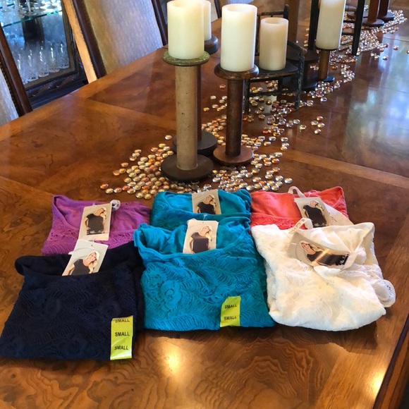 Leo & Nicole Style 34264c Flower Lace Top shirt sleeves. Condition they are New with tags. Self. 65% Cotton 35% Nylon. Lining. 95% Rayón 5% Spandex. Made in Vientam. Different colors: 2 in Aqua Blue / 1 in white /1 in Marine Blue /1 in Coral /1 in purple. The are all in small size. Let me know wish color you want.