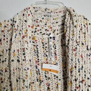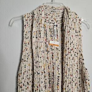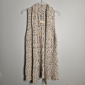 The Leo & Nicole Open Long Vest in beige with multicolored confetti is a stylish and colorful addition to any woman's wardrobe. Made from a comfortable polyester blend, this vest features an open design and a long length, perfect for layering over any outfit. The vibrant confetti detailing adds a fun and playful touch, making it easy to care for and perfect for any casual or dressy occasion in size small. New with tags.