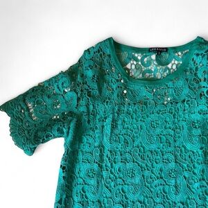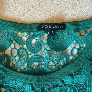 Turn heads in this vibrant emerald green lace dress from Leo & Ugo, a renowned French designer brand known for effortless elegance and modern Parisian flair. This stunning piece features luxurious Guipure lace in an intricate floral pattern, short sleeves, a round neckline, and a delicate scalloped hem. Crafted from lightweight fabric, (100% polyester ) it’s ideal for spring or summer events—from weddings to upscale brunches.