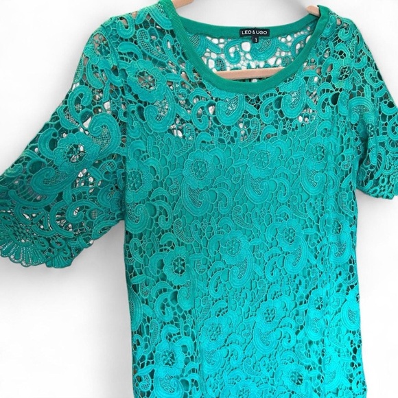Turn heads in this vibrant emerald green lace dress from Leo & Ugo, a renowned French designer brand known for effortless elegance and modern Parisian flair. This stunning piece features luxurious Guipure lace in an intricate floral pattern, short sleeves, a round neckline, and a delicate scalloped hem. Crafted from lightweight fabric, (100% polyester ) it’s ideal for spring or summer events—from weddings to upscale brunches.
