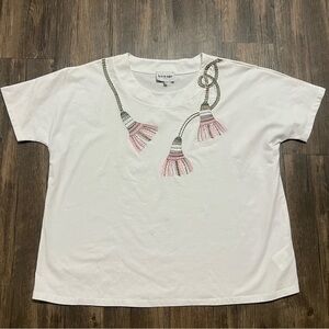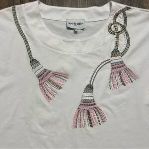 Leo & Ugo Paris White Pink Round Neck Embellished Women's Top Cap Sleeve Shirt L