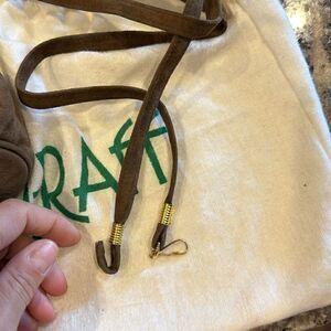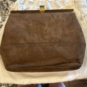 Strap is broken however can be fixed my a cobbler. In great vintage quality. Inside the bag looks like it was never used. 100% suede with leather trim. Can be worn as a clutch. Comes with dust bag
