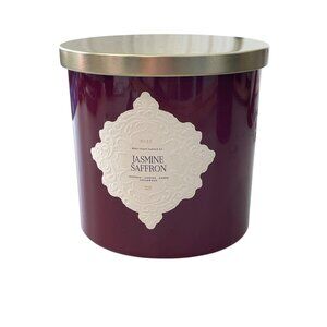 This 24-ounce Jasmine Saffron scented candle is crafted with USA vegetable wax and lead-free wicks for a safe, quality burn. Vibrant red glass and gold lid add elegance.