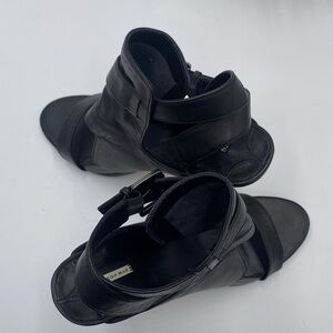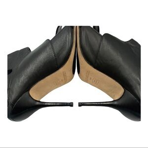 Loving the look this cross between a pump and a bootie gives off. Lux black leather shoe, features a toe strap & a wrap around ankle strap for a sexy twist to a classic shoe. These are made of a butter soft black leather all over.