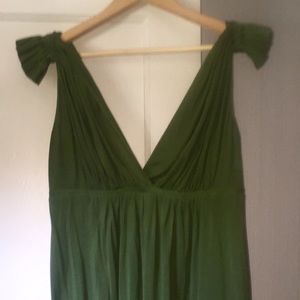 This limited edition gorgeous olive Grecian-inspired dress is a light silk and wool blend. Only worn once. It's very flowy and has a soft draped neckline in the front and back. Has a very subtle hi-low hem.