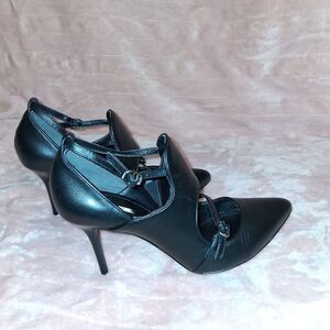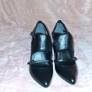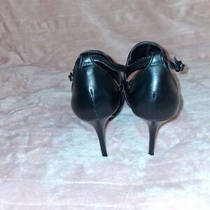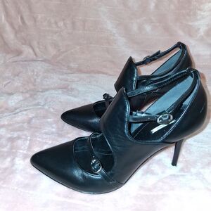 Step out in style with these elegant black leather heels. Pointy toe and buckle strap detail. Pre-owned in good condition. Please refer to pictures for best description and condition verification.