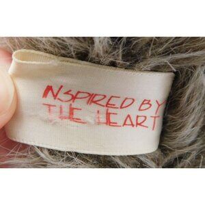 LEONA BEAR- Greyish-brown jointed teddy bear with green bow. Tag says 'Inspired by the Heart'.