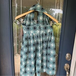 Add a pop of retro charm to your wardrobe with this sleeveless silk dress featuring a bold teal and black starburst geometric print. The flattering A-line silhouette, keyhole neckline, and soft silk fabric make it perfect for summer parties, date nights, or layered looks. Lightweight and comfortable with a vintage-inspired vibe.