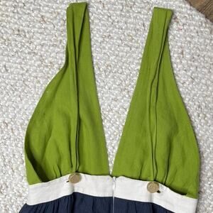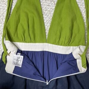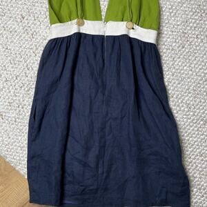 Deep V-neck, halter style. Buttons on back. Can unbutton and criss-cross straps. Zips at back. Size 4.