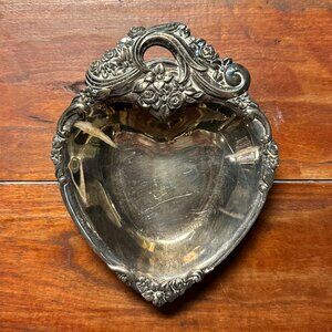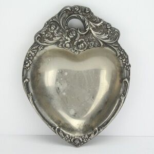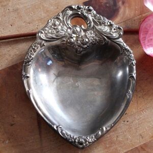 This elegant vintage silver heart-shaped dish features intricate floral detailing, adding a touch of timeless charm to any décor. Perfect for holding small trinkets, jewelry, or serving as a decorative accent piece, this dish combines both beauty and functionality. Its delicate craftsmanship and antique appeal make it an ideal addition to your collection or a thoughtful gift for someone special.