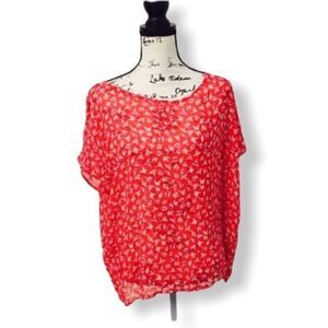 Leonard St. sheer oversized red blouse with all-over bird print - no size tag - would best fit a medium (but because it is oversized it could fit a small-large) - 100% silk