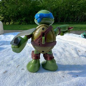 Leonardo Talking Teenage Mutant Ninja Turtles 6 inch Half-Shell Heroes toy from 2014, toy still talks and arms move when the lever on the back of the shell is pushed down, includes original weapons and has scuffs and scrapes as shown in the pictures.