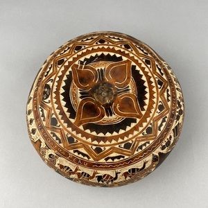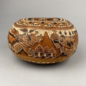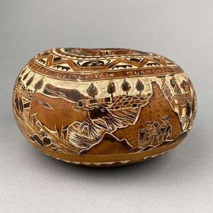 Leoncio Veli Peru carved storyteller gourd bowl with lid depicting llamas, mountains and people. In good, preowned condition. Measures approx. 4.5"H with a diameter of 8.5".