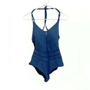Leonisa Mesh Cutout One-Piece Slimming Swimsuit Size US Large/36. Mesh cutouts throughout stomach and down chest. Tie in back with cutouts. Small untreated mark on the left side, but not noticeable from afar. Otherwise in excellent condition.